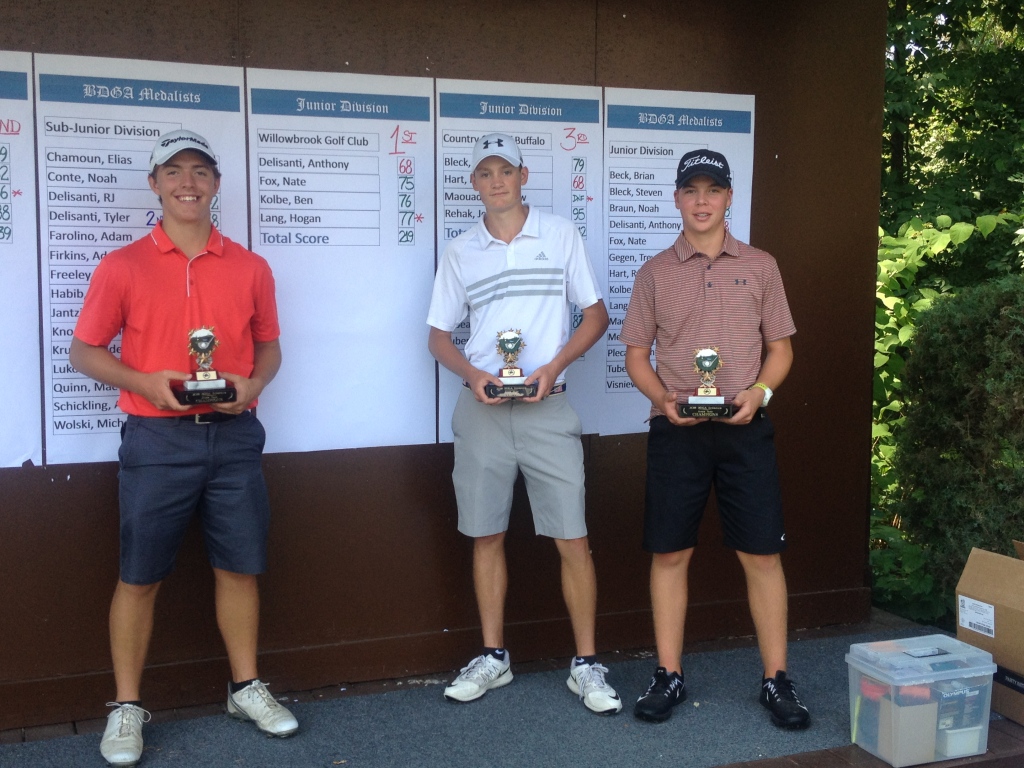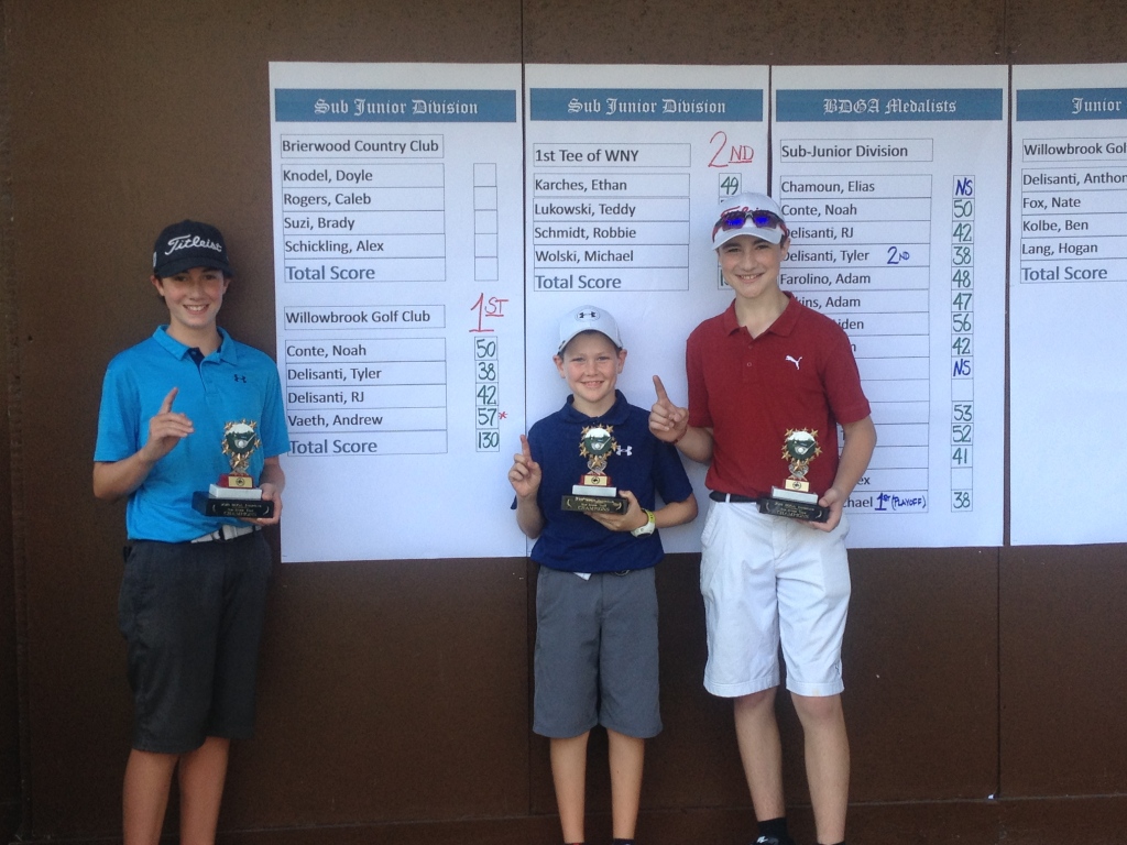 The Buffalo District Golf Association Interclub Championship was held at Park Country Club on Thursday, July 26. Willowbrook Golf Club dominated the event. Willowbrook swept the team portion of the Championship. In the Sub-junior Division (below left), Willowbrook's Noah Conti, Tyler Delisanti, RJ Delisanti and Andrew Vaeth posted a team score of 130 to take the title. In the Junior Division, Anthony Delisanti, Nate Fox, Ben Kolbe and Hogan Lang (below right) posted a score of 219 to take the title. Team totals were based on the low 3 of 4 scores.