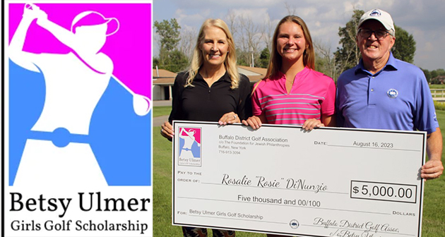 On August 16th, 2023, a number of friends and family of Rosalie DiNunzio gathered at Glen Oak Golf Couse in Amherst. The purpose was to present the first annual Betsy Ulmer Girls Golf Scholarship, an endeavor a long time coming. Making the presentation were James Mohan of the Buffalo District Golf Association board of directors, John Osberg, director of development and foundation operations for the Western New York section of thePGA of America, and Mrs. Ulmer herself. Mr. Mohan spoke eloquently about Betsy’s long participation in golf matters in western New York, and her tireless devotion to the expansion of access for girls to the game.