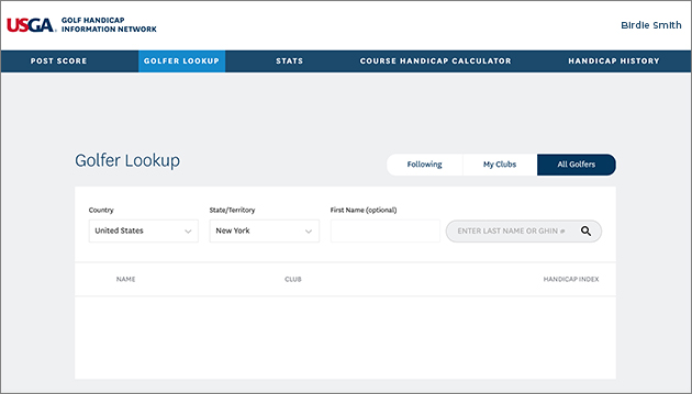 You'll need to login to your GHIN account by entering your GHIN number and last name. From there, click the "Golfer Lookup" tab and using the search function under "All Golfers", or you can specify to "My Club". The app allows you to follow your friends and easily access their information under the "Following" tab.