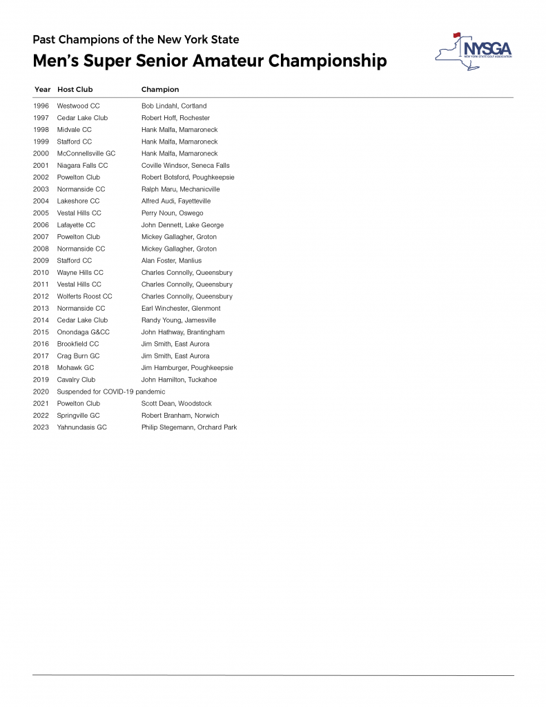 Year SUPER SENIOR & LEgend Host Club 2025 Jim Mueller Soaring Eagles GC 2024 Jim Mueller Crag Burn GC 2023 Phiip Stegemann En-Joie GC 2022 Robert Branham Springville CC 2021 Scott Dean The Powelton Club 2020 No Tournament -- 2019 John Hamilton Cavalry Club 2018 Jim Hamburger Mohawk GC 2017 Dr. Jim Smith Crag Burn GC 2016 Dr. Jim Smith Brookfield CC 2015 John Hathaway Onondaga G&CC