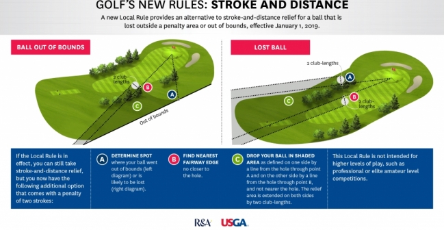 One of the most significant and talked-about changes in the new Rules of Golf for 2019 was the introduction of an alternative to stroke and distance for a ball that is lost or out of bounds. Before we go any further on this topic however, let’s first clarify that stroke and distance is still the default in the Rules of Golf! The alternative relief procedure is only available when the golf course or the Committee running a competition has decided to put the optional Local Rule into effect. Before using it, you should verify with the person in charge of the golf course (often the pro) or the competition as to whether or not it is in effect.