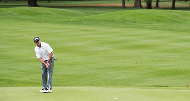 “It was brutal. I was just trying to hold onto the club,” he mentioned of playing in heavy rain to begin the tournament. “Course is in great shape; the greens are rolling nice. The putter saved me pretty much all day. It kind of reminds me of Brookfield,” referring to the buffalo-area course where he won a few years back.