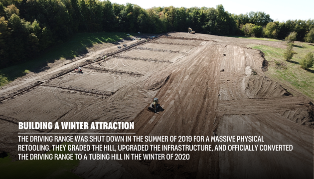The Odenbachs began researching ways they could keep the facility open during the offseason, eventually settling on the idea of a snowtubing park. The driving range was shut down in the summer of 2019 for a massive physical retooling. They graded the hill, upgraded the infrastructure, and officially converted the driving range to a tubing hill in the winter of 2020.