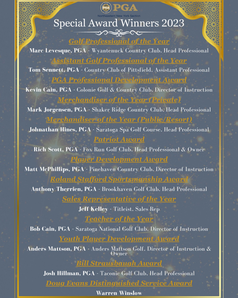 All of the 2023 NENY PGA Special Award Winners will be celebrated for their achievements at the NENY PGA Special Awards Banquet set for Thursday, November 16, 2023.