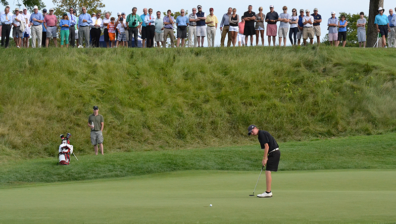 In the 2013 Men’s Am at Schuyler Meadows, Matt Stasiak had been chasing leader Victor Fox since the first round. He finally pulled even with Fox by the time they teed off the 71st hole. Then, Stasiak promptly made a heart-wrenching double bogey, apparently sealing a runner-up finish. However, fortunes flipped on the par-4 final hole as Stasiak hit his best drive of the day. Watching Fox wrestle with the results of a bunkered tee shot, Stasiak knocked it on and drained the birdie putt. Fox missed an eight-foot bogey putt, giving Stasiak a three-shot swing and a rollercoaster one-shot victory. Never give up!