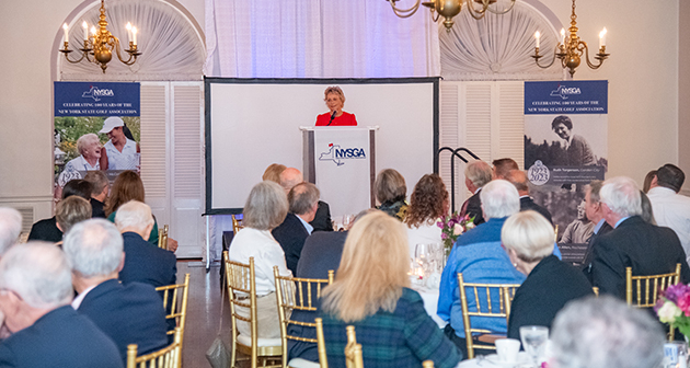 The program included presentations from NYSGA President Henry Fust, golf writer Kevin Casey, who authored a substantial amount of written content for the centennial booklet, along with NYSGA Hall of Fame member Dottie Pepper, who was inducted in 2018. She also is the only player to win the NYS Girls' Junior Am and NYS Women's Am in the same year (1981), and totaled three NYSGA titles in the early 80s before turning professional and moving on to a succesful playing, and now broadcasting career. The Master of Ceremonies was the NYSGA's Director of Marketing & Partnerships, Dan Thompson, who was the staff liaison for the centennial sub-committee. Closing remarks were also made by NYSGA Executive Director Bill Moore to close the special evening.